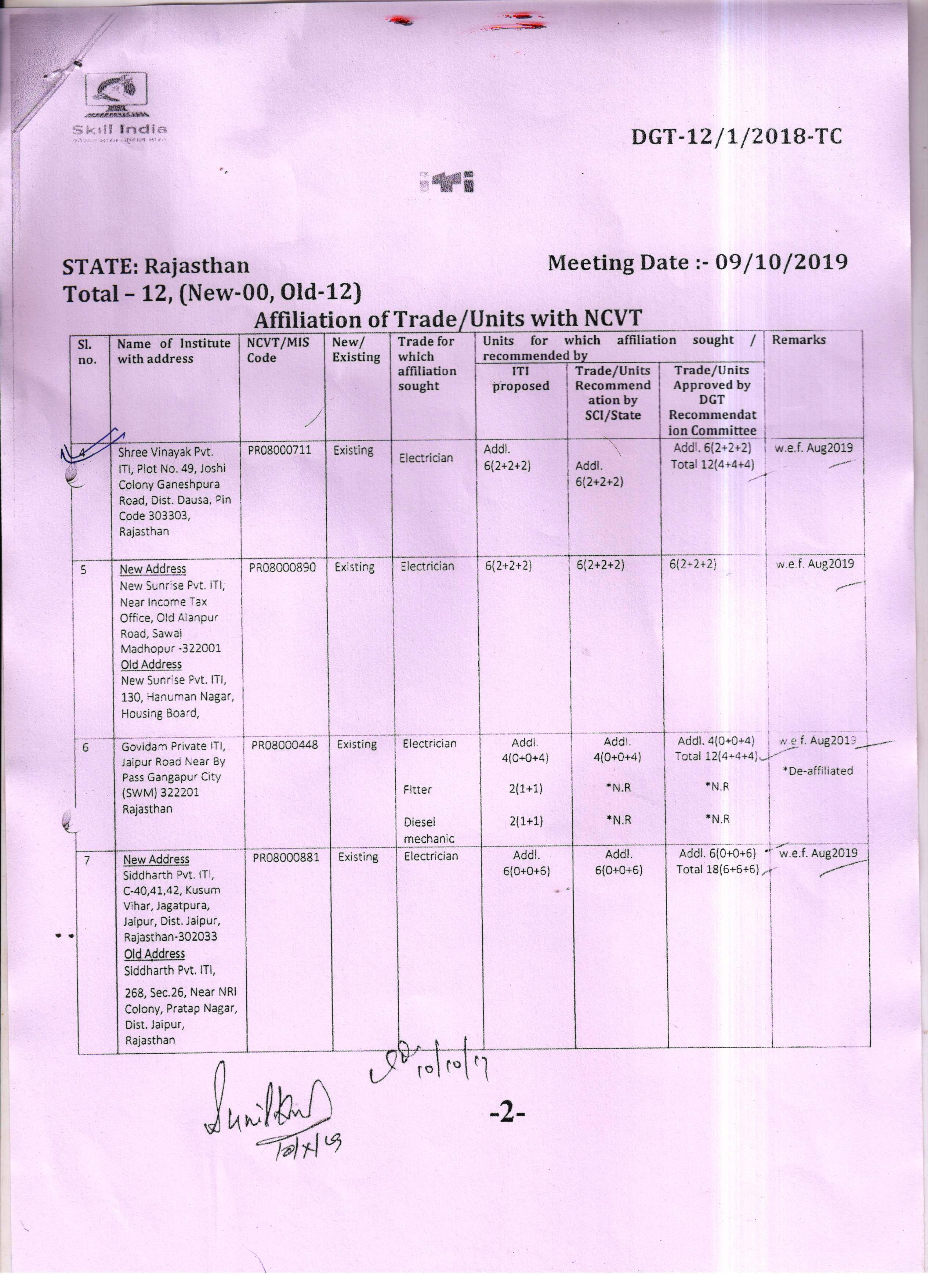 Name of the Trade | No. of Units | Shifts Running 1 | Shifts Running 2 | Shifts Running 3 | Seating Capacity per Unit | Total Seating Capacity | Affiliation Date | DGET Order |